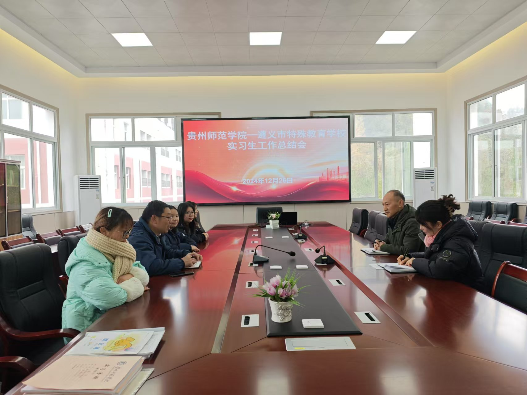 特殊教育系主任雷经国赴遵义市特殊教育学校开展教育实习工作总结,实习总结大会在遵义市特殊教育学校举行,参会人员还有遵义市特殊教育学校副校长赵石、教务处主任徐文婧以及所有实习生。