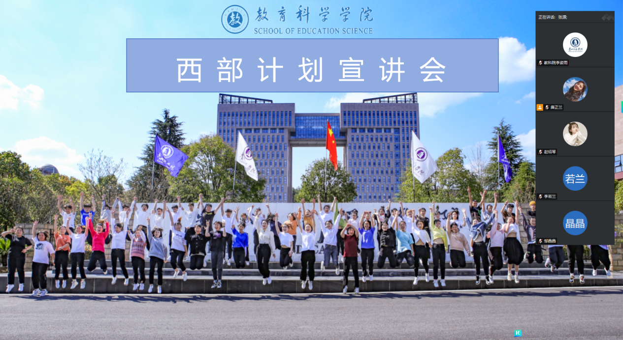 通过线上平台成功举办了西部计划宣讲会。本次会议旨在向广大教科院学生深入宣传西部计划的重要意义,激发同学们的参与热情,为投身西部建设贡献青春力量。此次会议由学院团委书记张源老师担任主讲嘉宾,团委负责人李姿雨老师担任主持人。