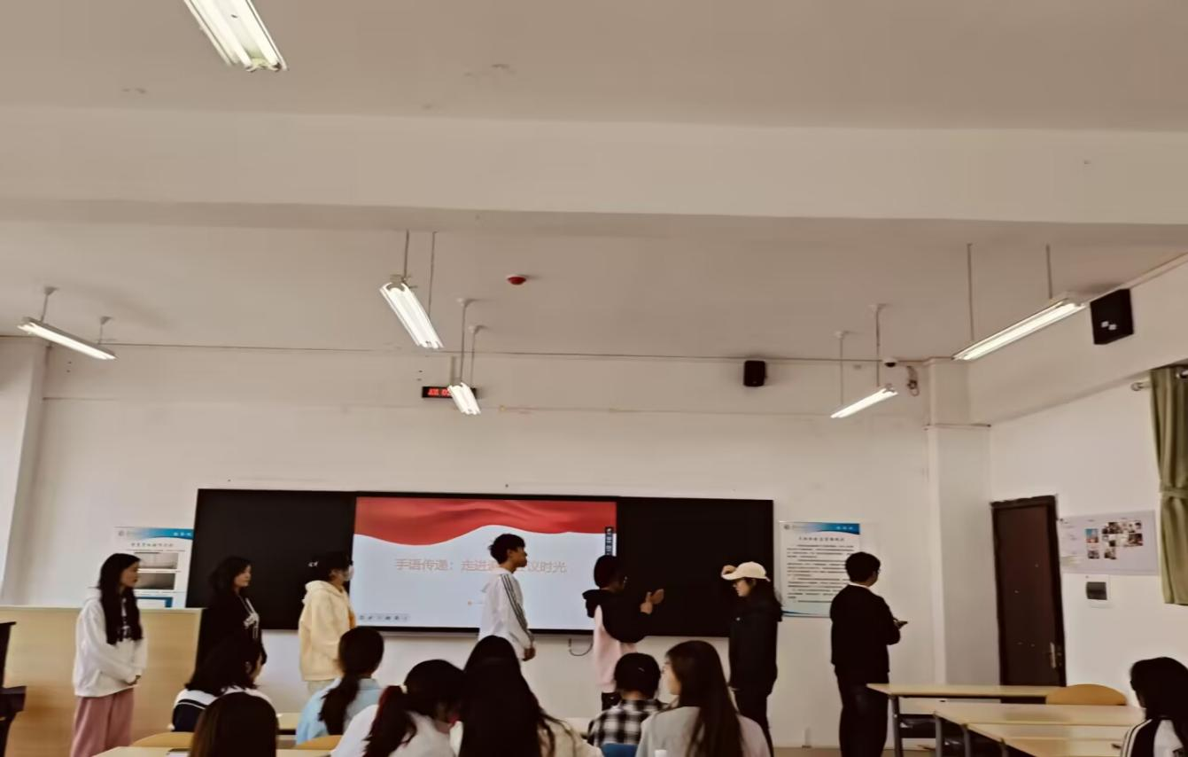 在“手语传递精神”环节,将班会氛围推向高潮。同学们用极具专业特色的手语来表达对特殊教育的喜爱以及对于国家建设需要的高度靠拢态度。同学们纷纷表示,通过这场特殊的活动,更加深刻地认识到自己所肩负的历史使命,要像革命先辈一样,在特殊教育的岗位上,不畏艰难,坚守初心。