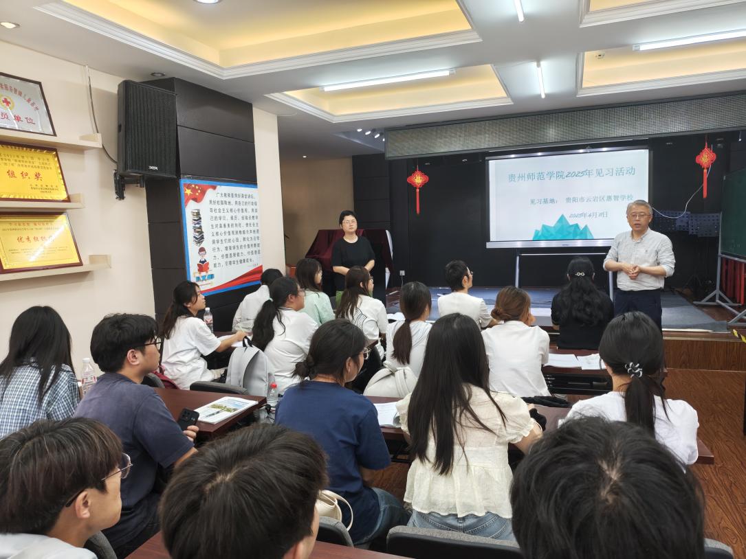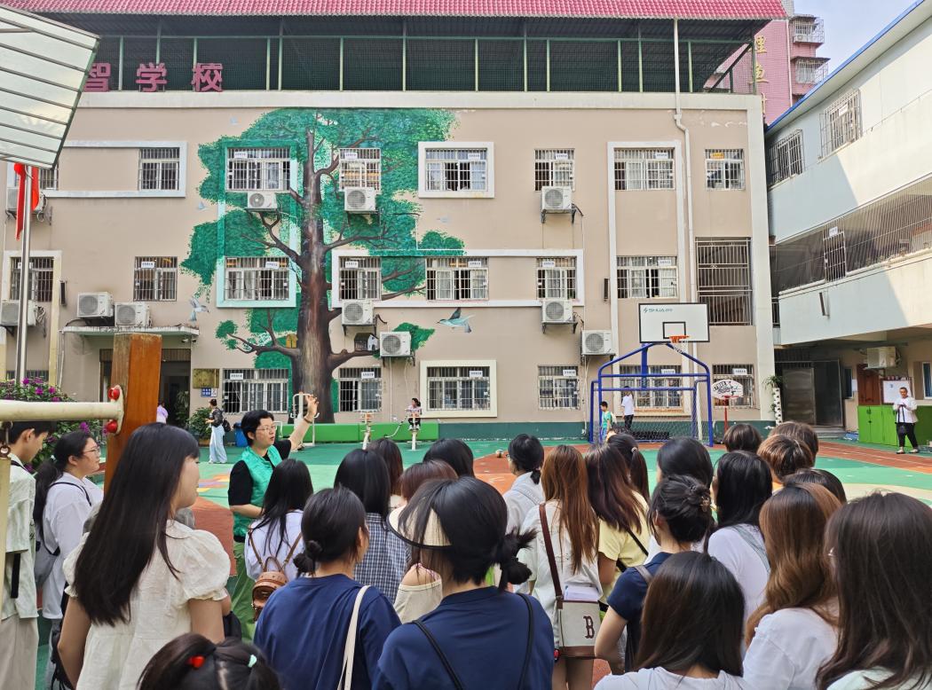 的见习师生参观学校,她热情地向见习师生们介绍贵阳市云岩区惠智学校的建筑与环境,学校教室分布与功能分区,学校整体布局、师生情况、校风校貌、校园文化建设等,这对师生深度了解特殊教育场景,亲身感受特殊教育的工作氛围具有重要价值,其不仅为学生开启了具身认知特殊教育实践的第一扇窗,也为后续特殊教育领域的深入学习与实践奠定坚实基础。
