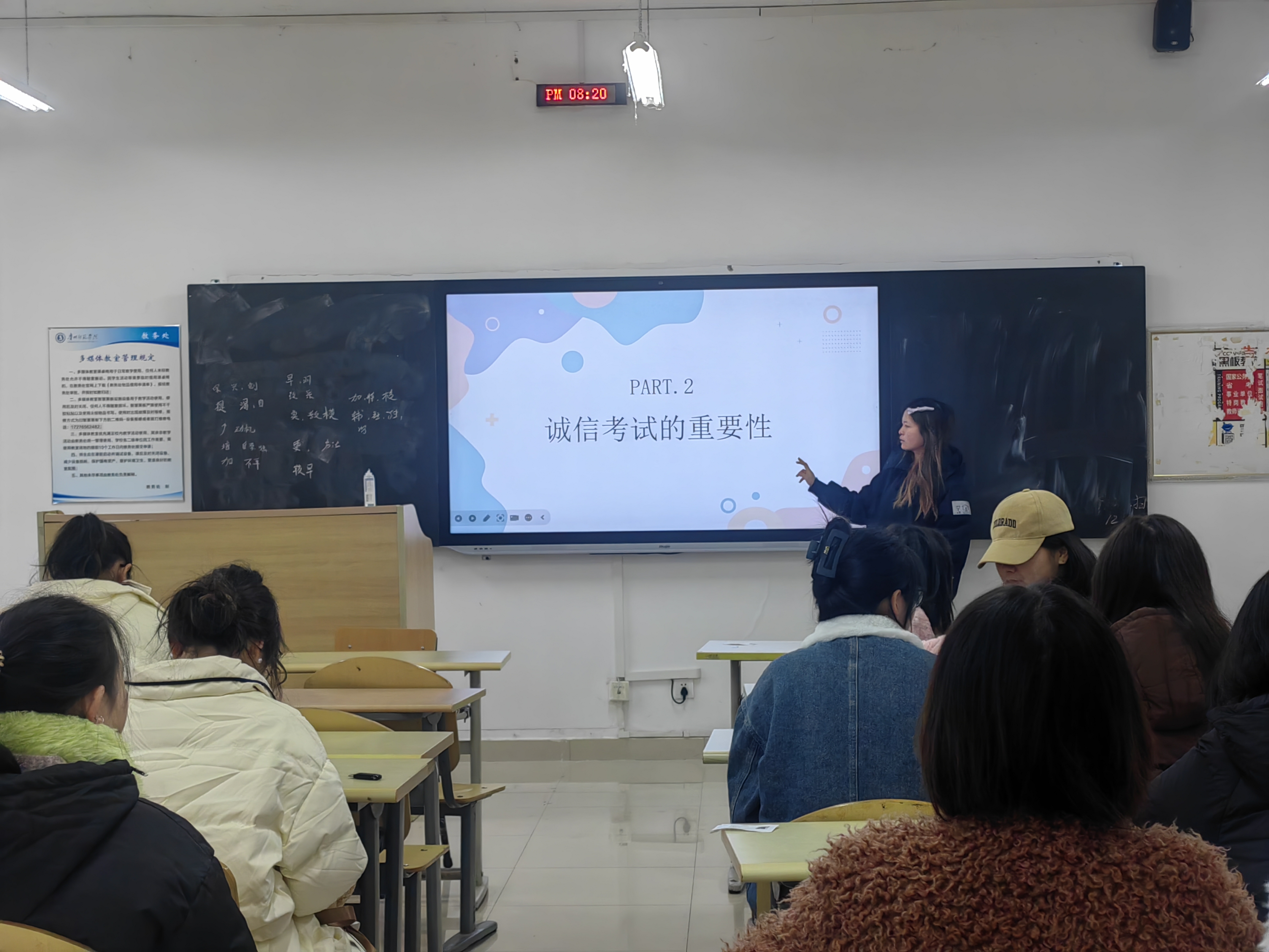 各班级在学校各教室开展了诚信考试主题教育班会。本次班会由各班辅导员和班干主持,旨在引导同学们树立正确的考试观念,强化诚信意识,坚决杜绝考试作弊行为。