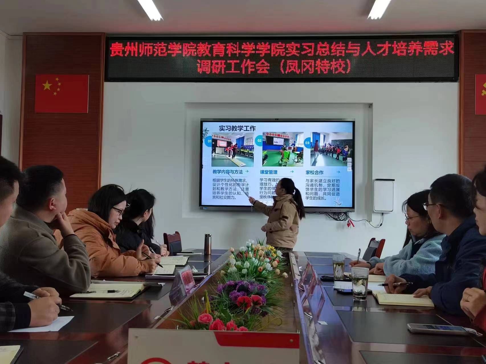 在凤冈县特殊教育学校,实习生代表李嘉旭汇报了5名特殊教育专业学生在凤冈特校的实习经历和心得。接着,凤冈特殊教育学校的实习指导老师、凤冈特殊教育学校的谢奎校长和朱宁宁副校长,以及我校特殊教育系雷经国主任、夏卉芳教授对实习工作进行了详细点评。