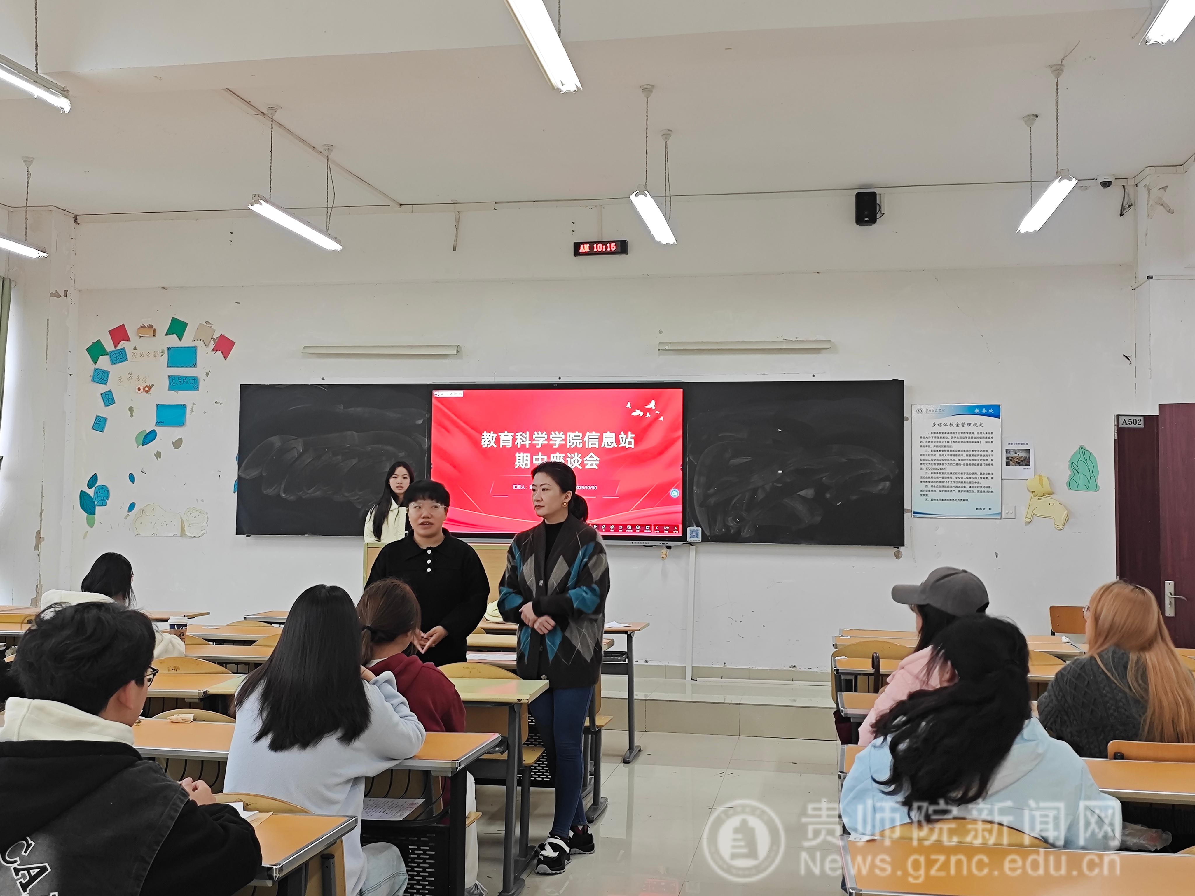 学生信息站在逸夫楼A502教室召开期中座谈会。信息站全体成员出席参会,学院指导老师、督导组组长马慧慧老师,校级督导瞿智琳老师列席参加。