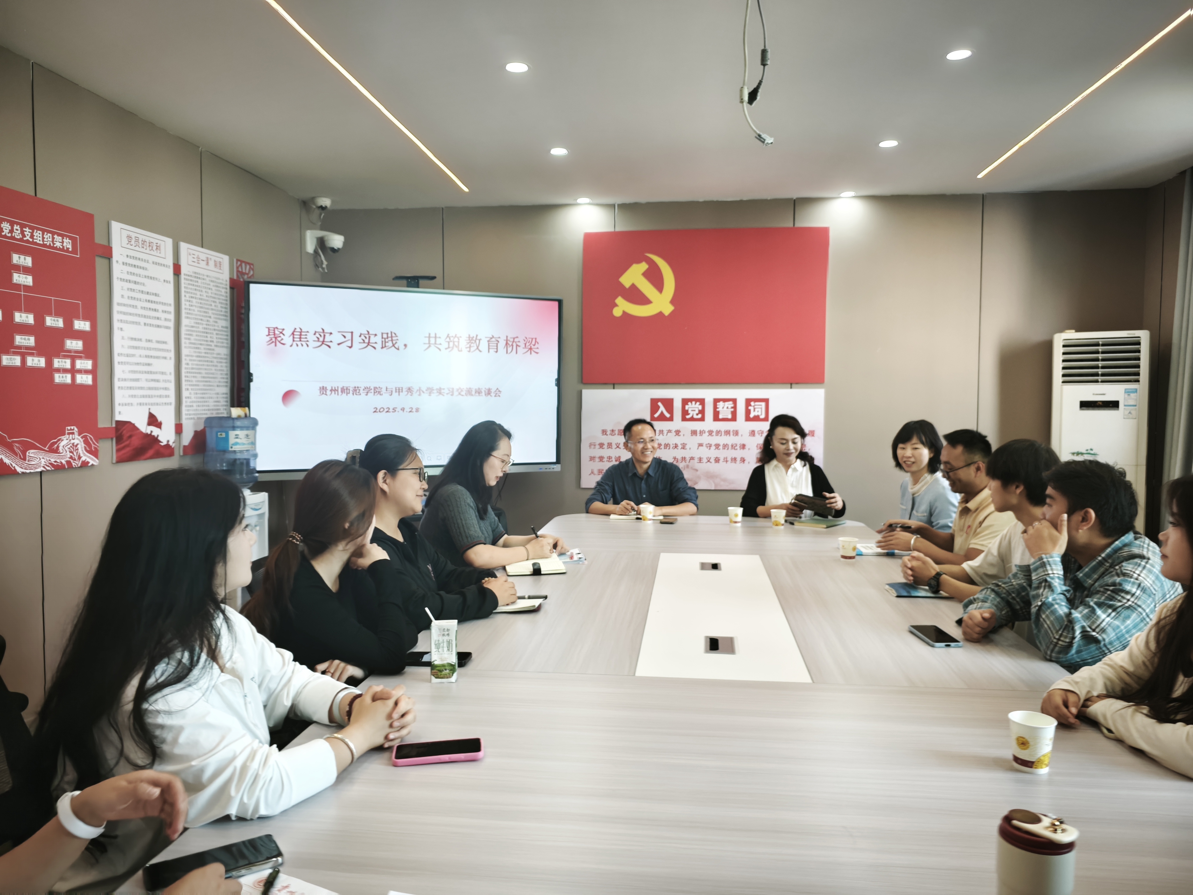 黎平辉副院长、督导组莫太极老师及实习点负责人申利丽老师同甲秀小学邓小玲校长、黄艳主任与实习负责人王丹老师,共同召开2025届艺术教育专业实习生座谈会。