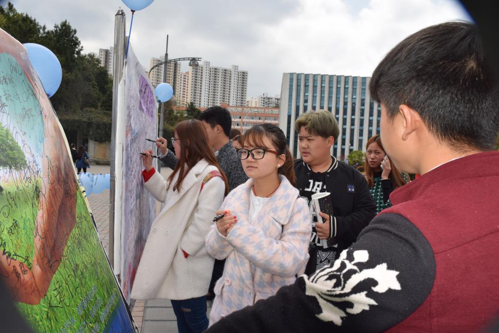全体学生呼吁全社会关注自闭症儿童,给“星星的孩子”许个未来,加深人们对自闭症儿童的了解。活动中,同学们在校内主要道路上的树上都挂上了蓝色的气球,使得整个校园一篇蓝色,同学们向过往的行人发放气球,并介绍活动的目的,倡导他们关爱自闭症儿童,所有参与活动的人都在相应位置进行签名、抽奖与玩偶合影。