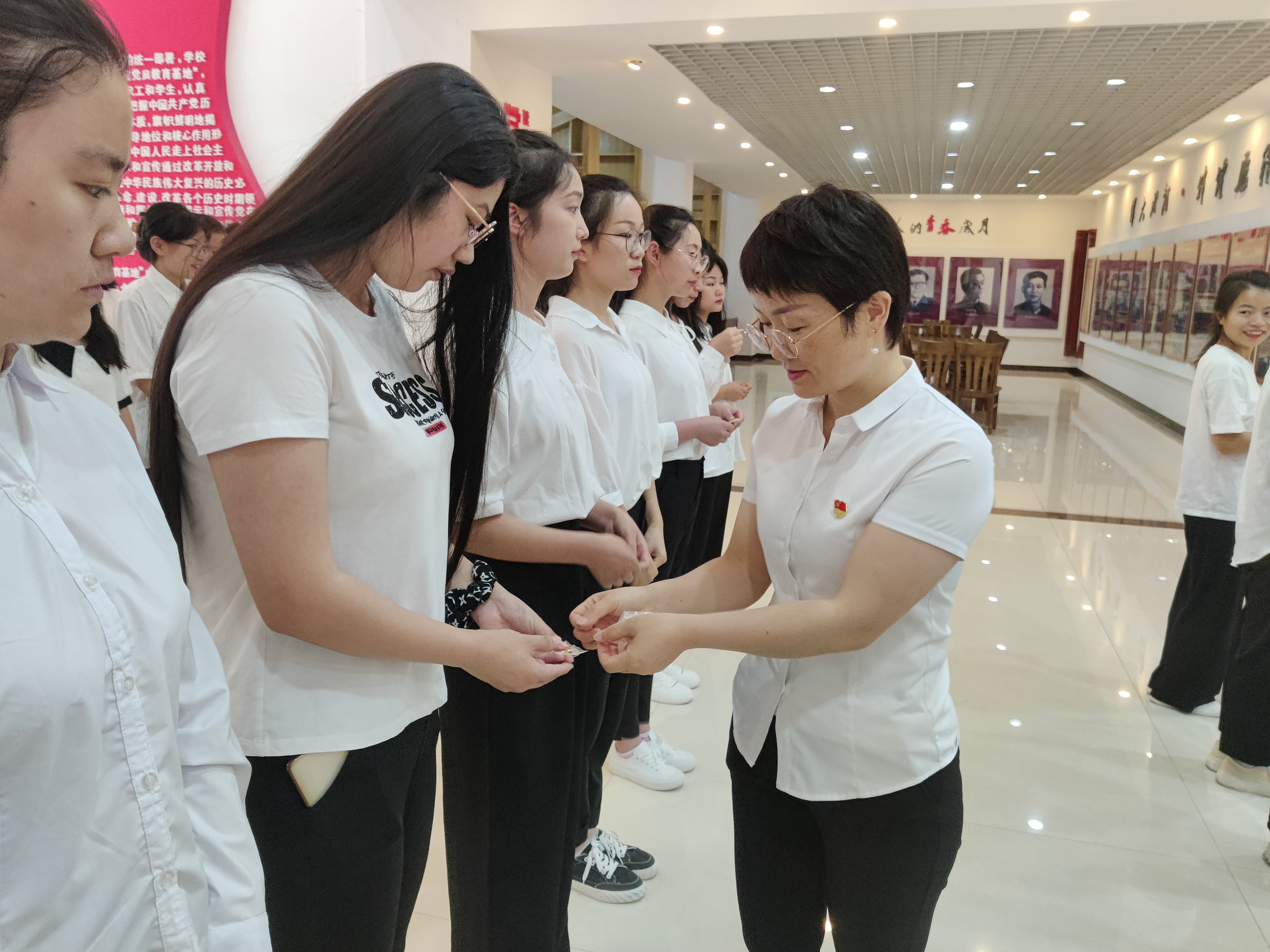 随后,由彭祥友和教师党员代表吴晓英为新党员佩戴党徽。在学生党支部书记张源的带领下,40余名党员举起右拳,面对党旗郑重宣誓,许下为共产主义奋斗终身的誓言。