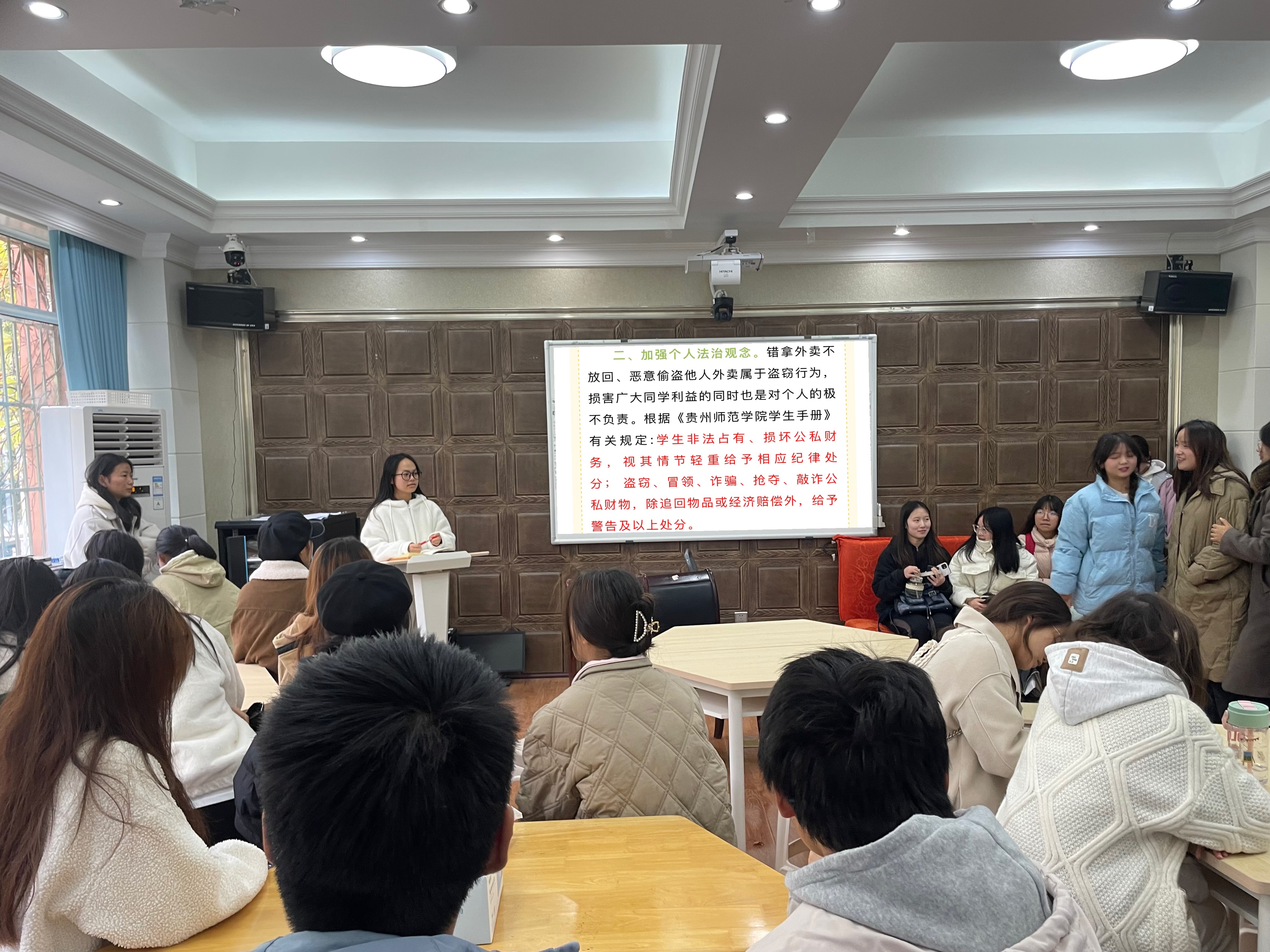 会议伊始,杨诗韵向大家介绍了本次会议的目的与意义,提到了外卖丢失是校园生活中长期困扰着学生的严重问题,它不但给学生造成经济损失和生活上的巨大不便,而且还是盗窃违法行为。其次强调了错拿外卖不放回、恶意偷盗他人外卖属于盗窃行为,损害广大同学利益的同时也是对个人的极不负责。同时倡议我们在领取外卖时对自己负责、对他人负责,仔细核对小票信息,确认无误再行领取。最后倡议同学们增强外卖安全意识,加强个人法治观念,强化个人责任意识,提高相互监督意识。
