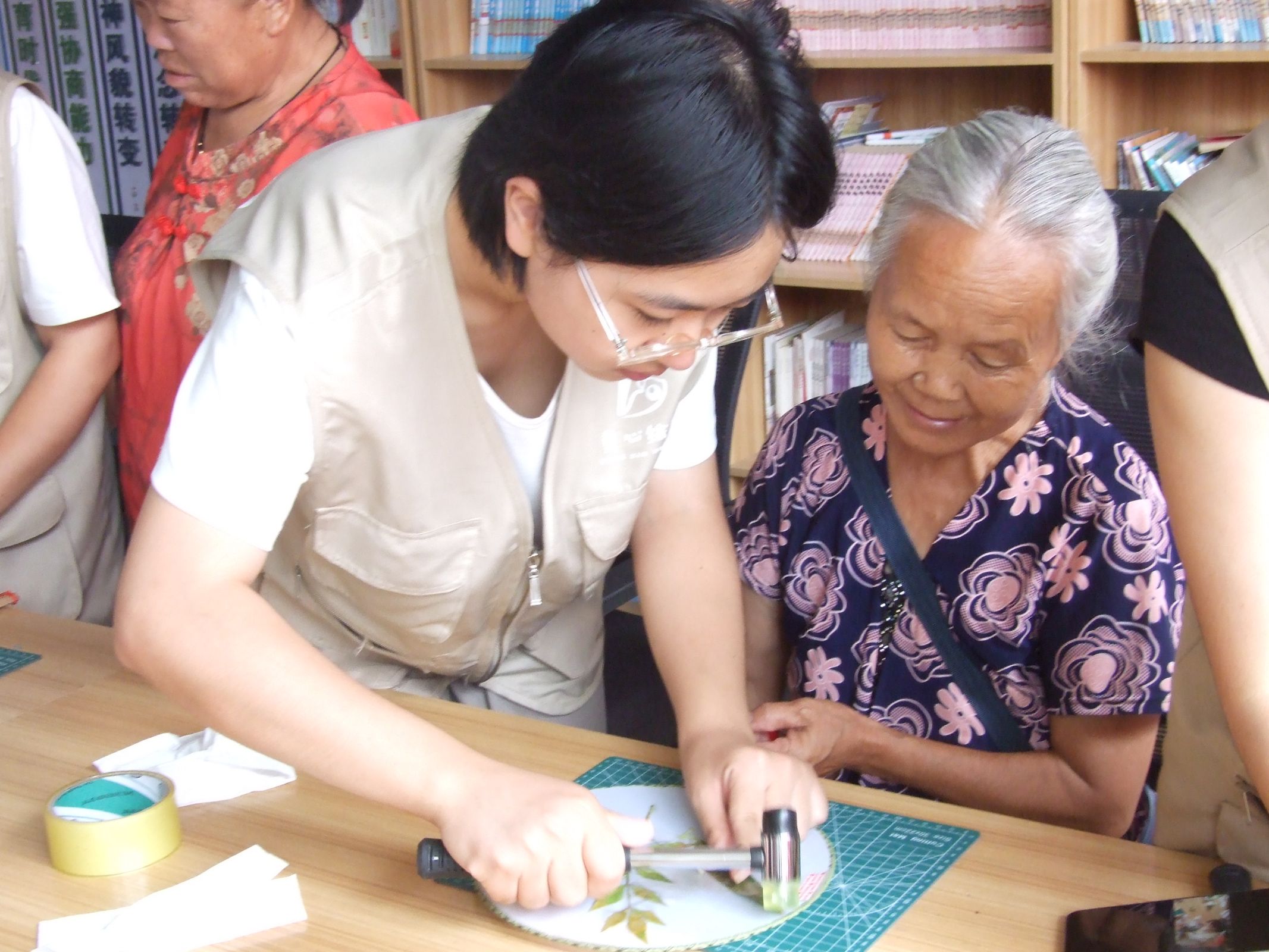 活动伊始,志愿者们提前准备好了各色植物、白色团扇和拓印工具。志愿者们耐心向大家讲解植物拓印的步骤:先将叶片平整地铺在团扇扇面,用胶带固定防止滑动;再用拓印锤敲打叶片,让植物汁液渗透到布料上;最后小心揭开叶片,一幅带着自然纹理的独特图案便呈现出来。对于行动不便或视力欠佳的残障人,志愿者们一对一地协助,手把手教他们摆放叶片、控制力度,整个过程充满了欢声笑语。65岁的李奶奶是第一次接触植物拓印,在志愿者的帮助下完成了自己的作品,看着团扇上清晰的叶片图案,她笑得合不拢嘴。现场不少人也纷纷展示自己的成果,互相交流着拓印时的小技巧,原本安静的活动室变得热闹而温馨。