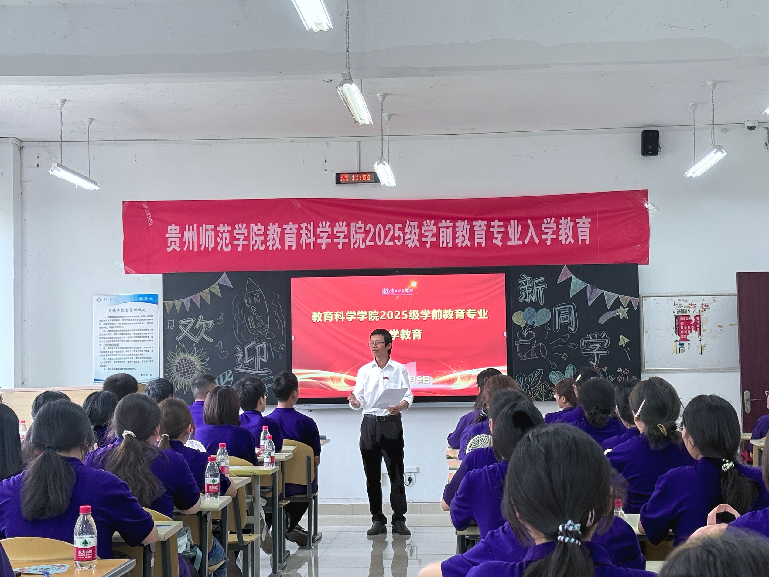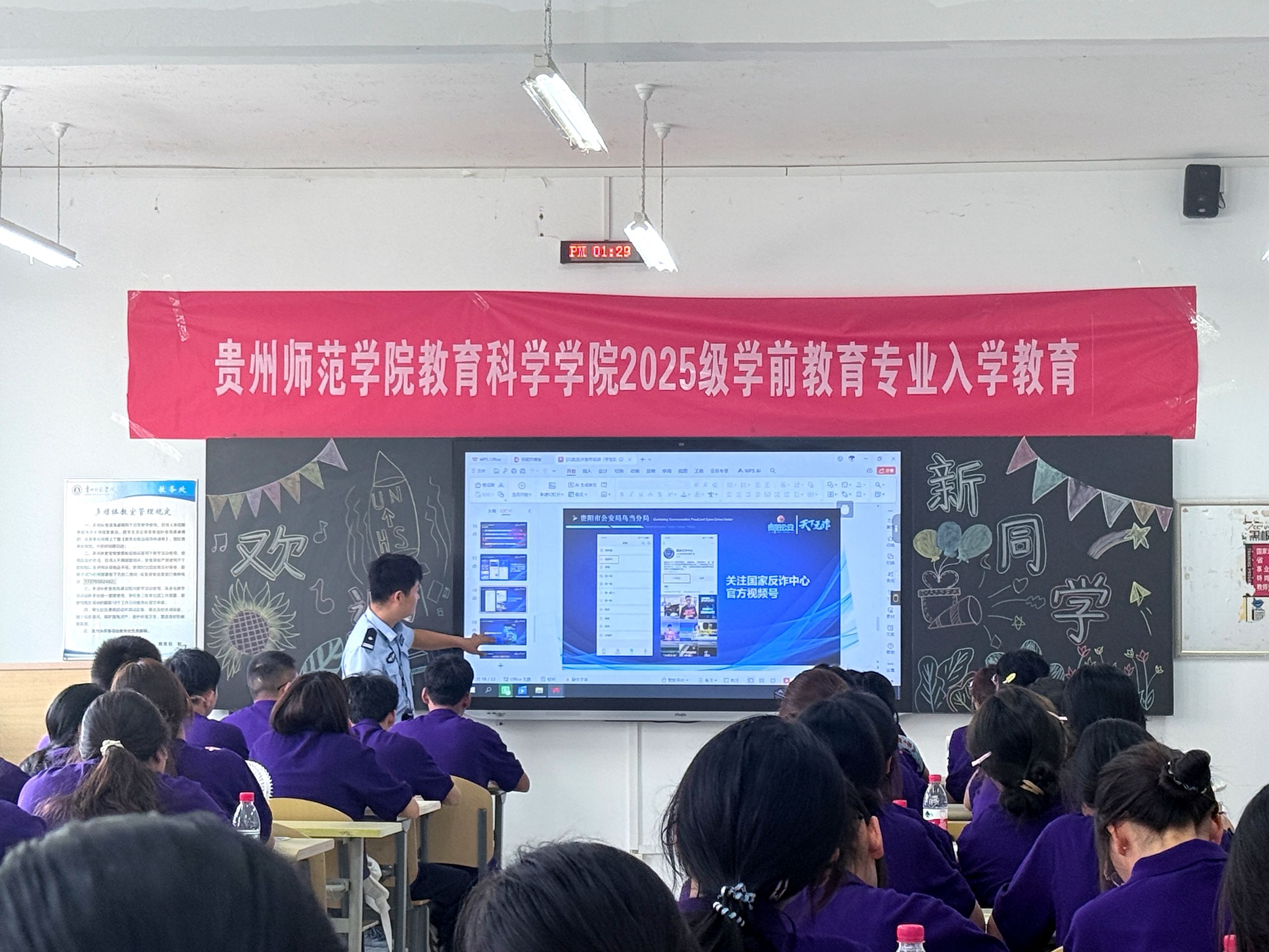 活动伊始,学院全体领导、团委、党政办各科室负责老师集体亮相,向新生致以热烈欢迎。随后,院长宋万琚发表致辞。他首先代表学院对2025级新生的到来表示祝贺,并简要介绍了学院的发展历程、学科特色与育人理念。宋万琚强调,大学是人生成长的关键阶段,鼓励新生珍惜时光、勤学善思、勇于实践,努力成为兼具专业能力与社会责任感的教育工作者。为进一步增强新生的安全意识,学院邀请高新路派出所民警进行入学反诈宣传教育。通过案例分析、防骗技巧讲解等形式,提醒新生警惕电信网络诈骗,保护个人信息与财产安全,筑牢校园安全防线。活动中,学院团委学生会负责人播放了2025年暑期“三下乡”社会实践宣传视频,生动展示了学院学子深入基层、服务社会的实践成果并分别介绍了部门职能与招新要求,鼓励新生积极参与学生工作,提升综合能力。最后,学院各专业系主任详细解读了人才培养方案,包括课程设置、学分要求、实践教学安排等内容,并针对考研政策、备考策略等进行了专题宣讲,为新生规划大学学习与未来发展提供了清晰指引。